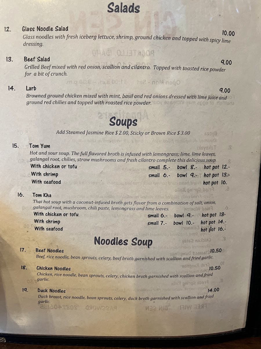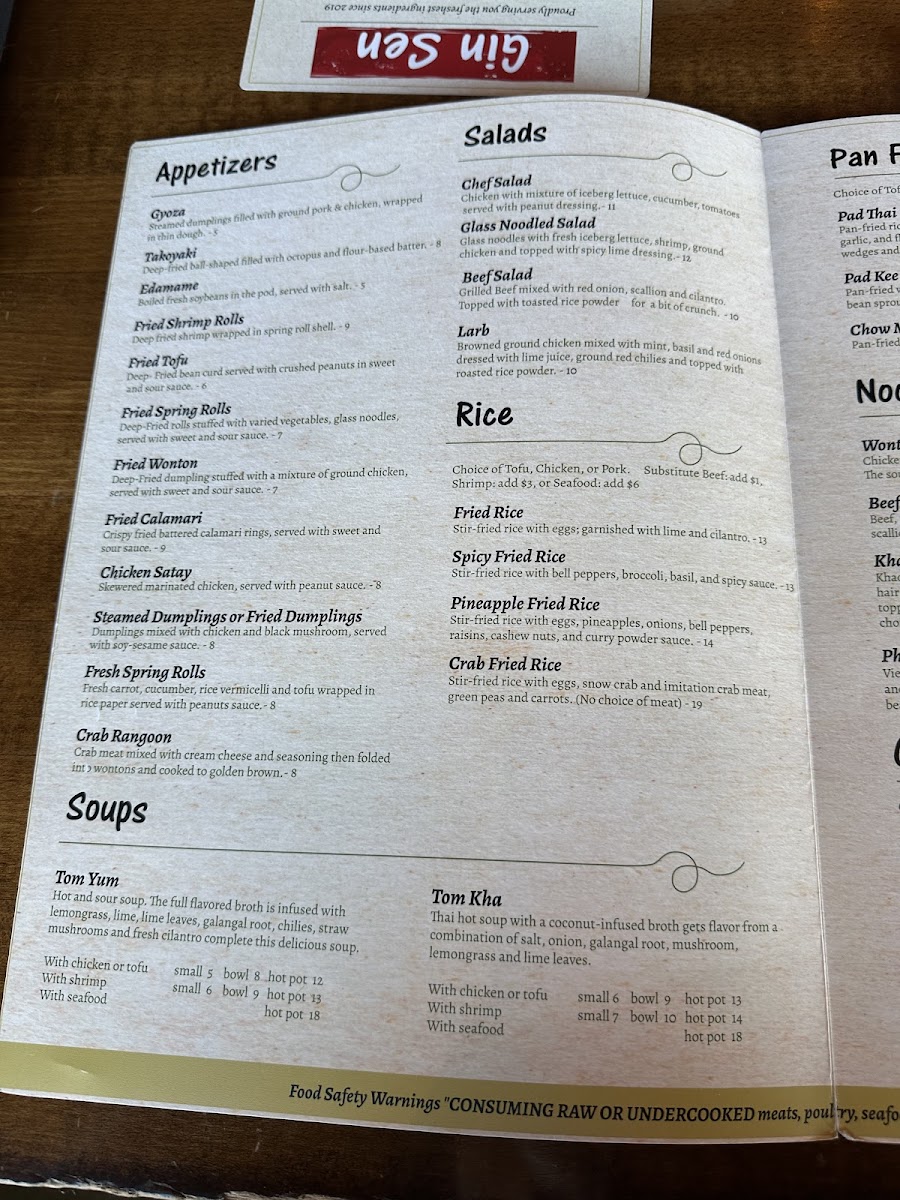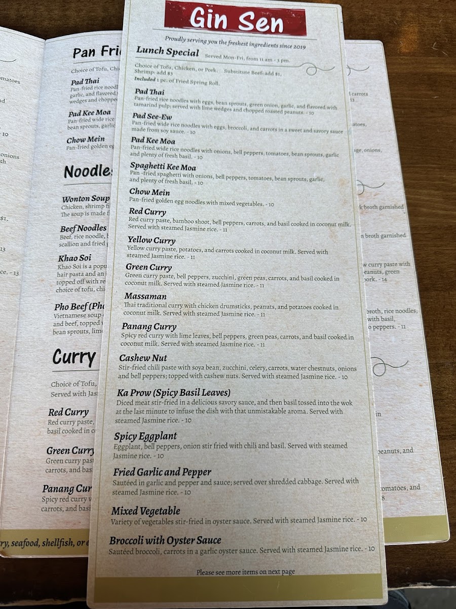 The menu at Gin Sen offers a thoughtful fusion of Thai and Japanese flavors, presenting a variety of dishes that feel both comforting and approachable. Whether you're stopping by for a casual lunch or a relaxed dinner, the selection ranges from warming bowls of ramen and beef noodles to lighter options like fresh salads and appetizers such as takoyaki or gyoza.